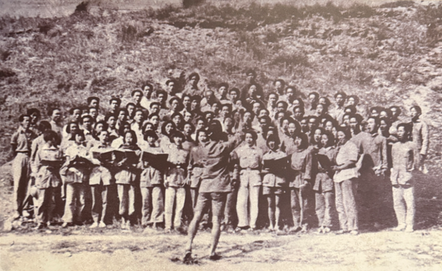 1940年,在下北漳村村边小河旁那片梨花盛开的树林中,前方鲁艺与抗大总校文工团联合排练《黄河大合唱》